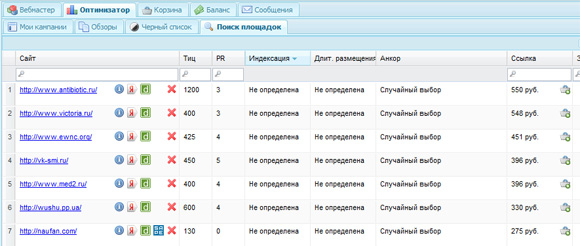 За счет использования технологии на платформе ExtJS в интерфейсе много можно настраивать, передвигать и менять размеры. Вообще сначала, возможно, потребовалось немного времени дабы вникнуть в нюансы оформления, но потом вам кажется, что это самая удобная из бирж ссылок. Визуально все представлено очень грамотно и цельно, достаточно один раз взглянуть на блоки чтобы понять где какие параметры указывать и т.п. Под глобальным меню вы можете видеть несколько закладок, каждая из которых открывает определенный подраздел — например, выбрали меню Оптимизатора и видим опции для него:
